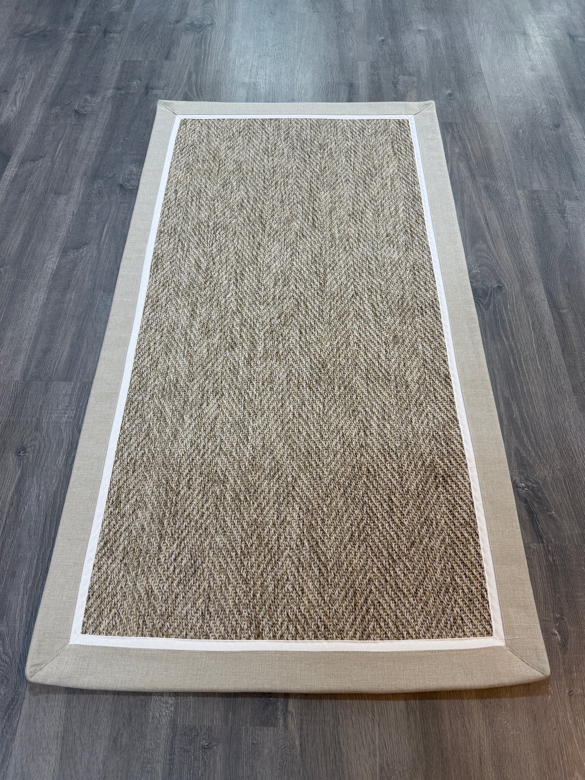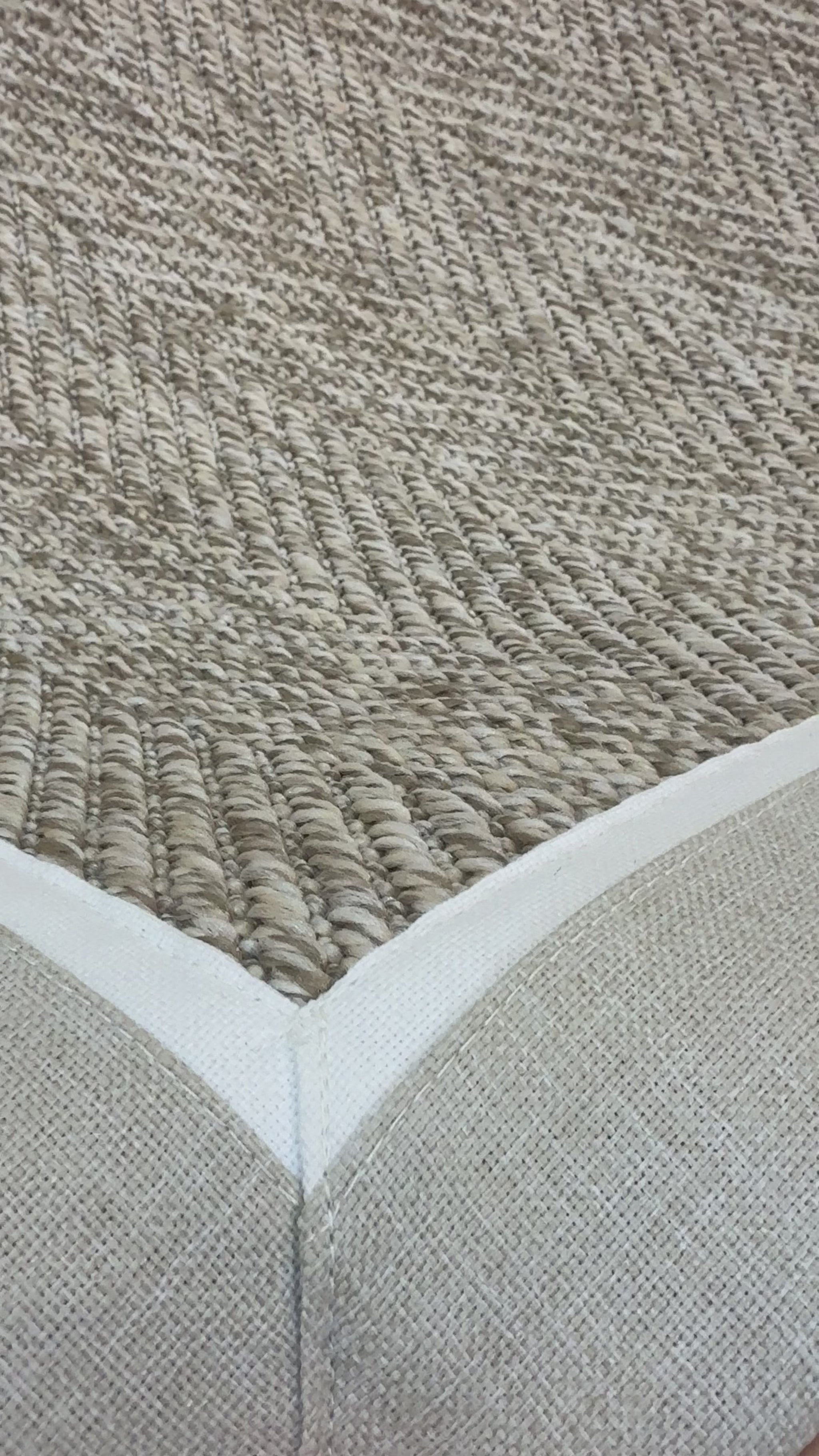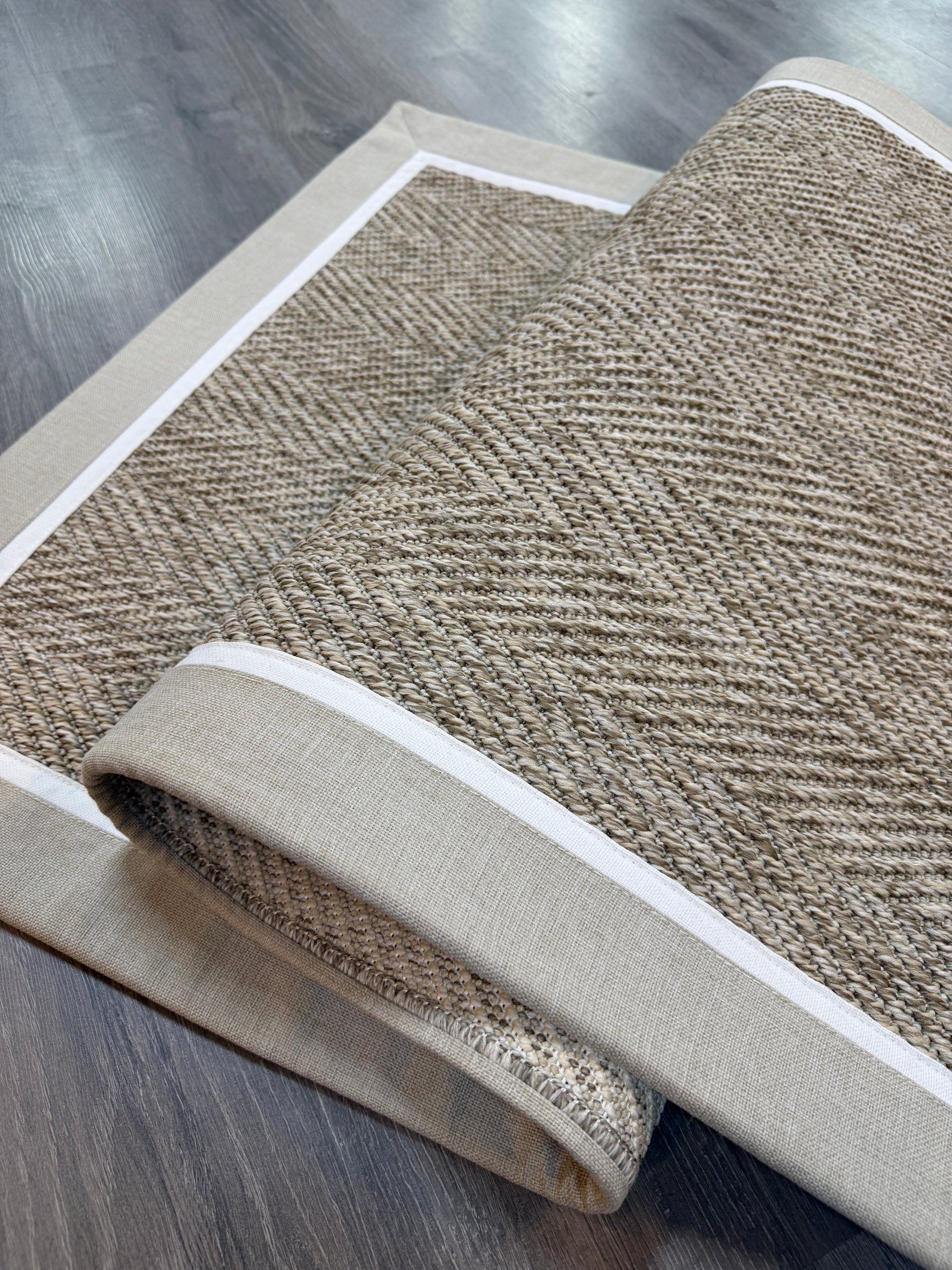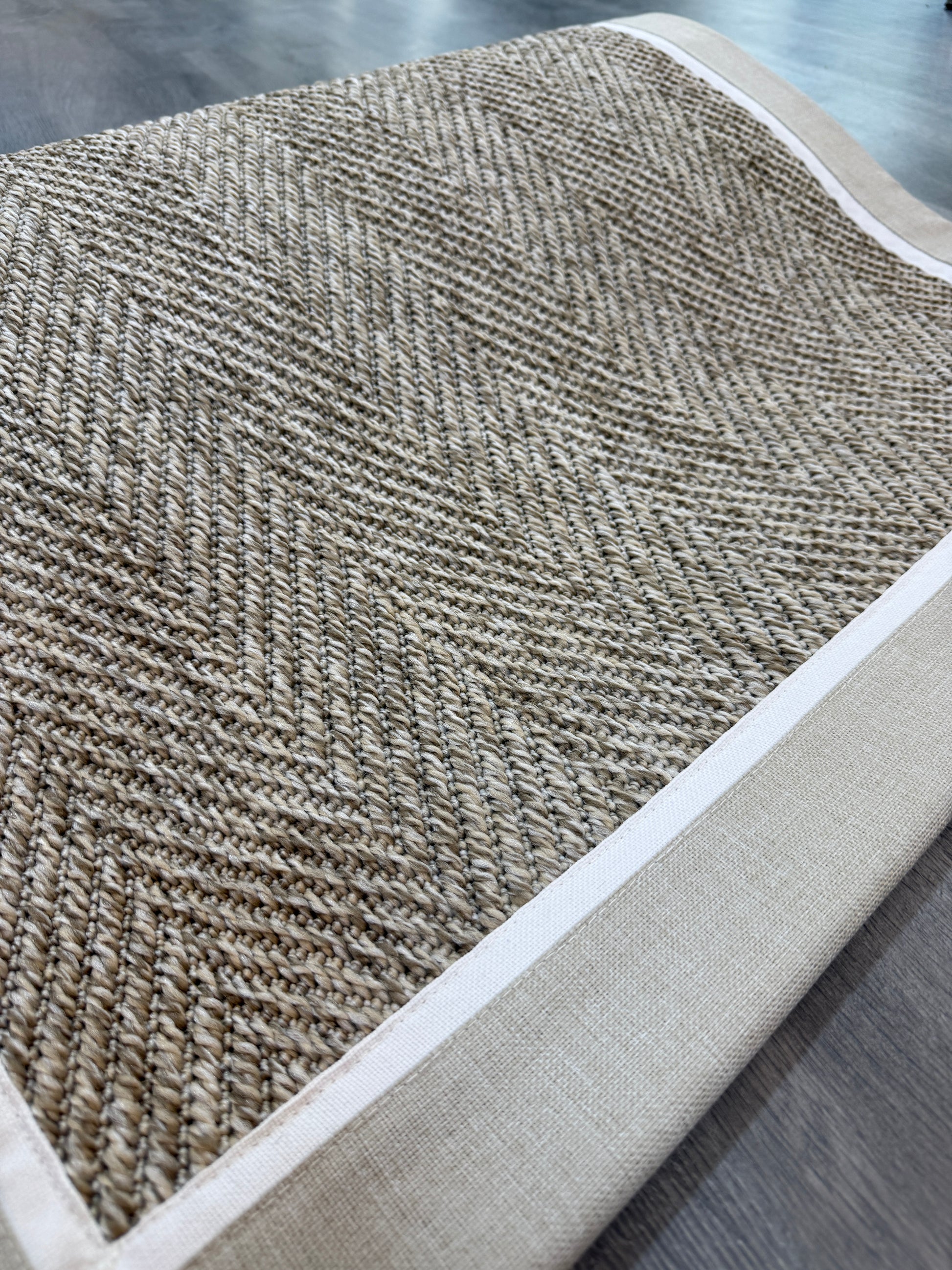 Evinize modern ve dayanıklı bir halı arıyorsanız, bu el yapımı kumaş bordürlü sisal halı tam size göre!