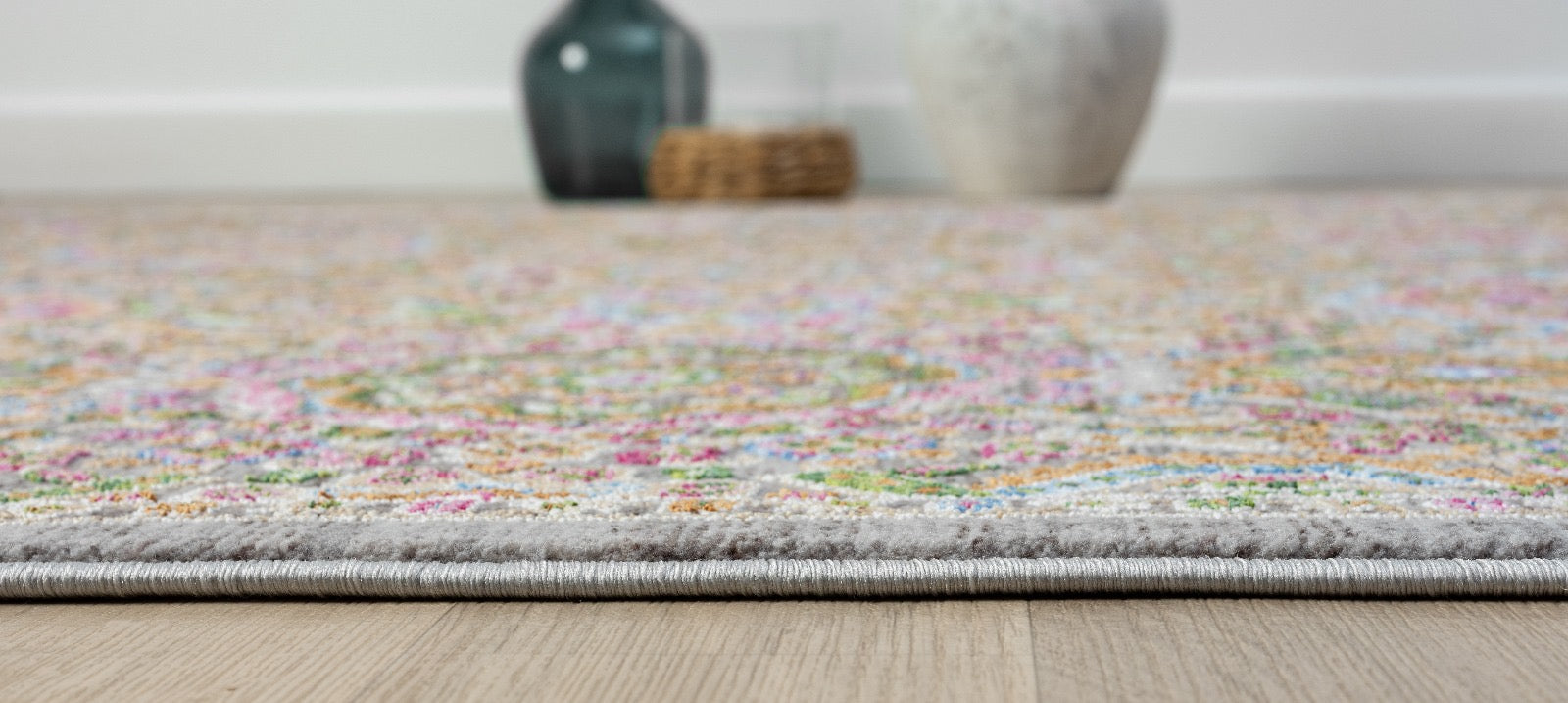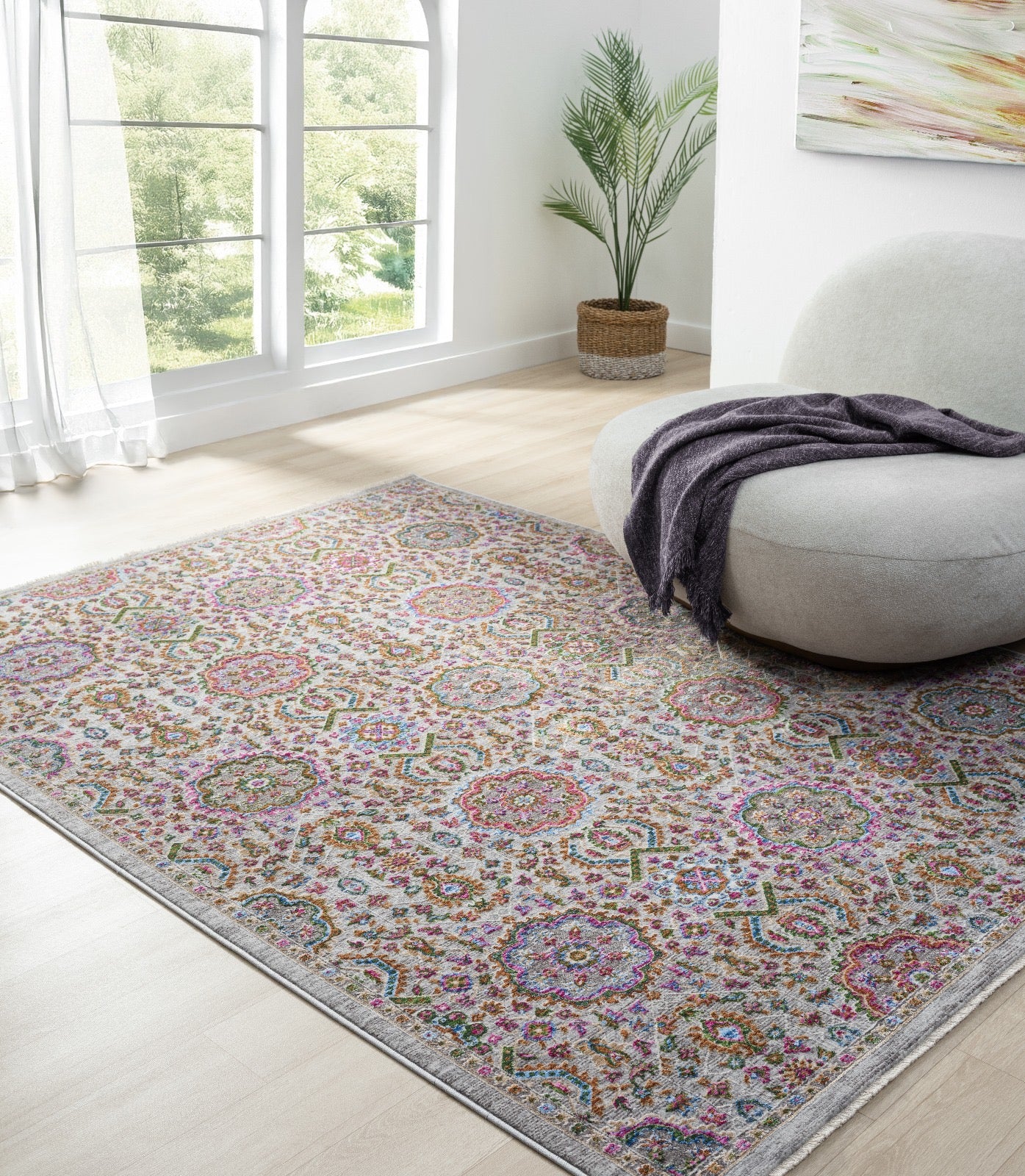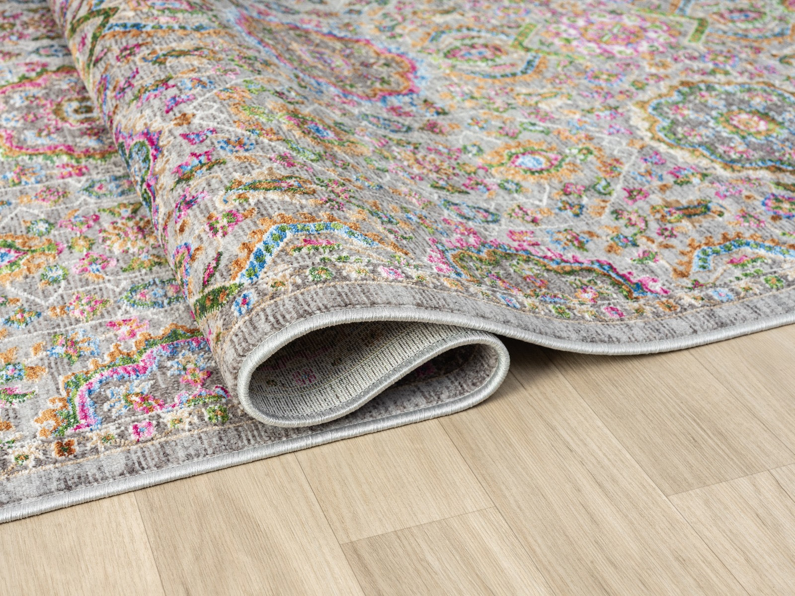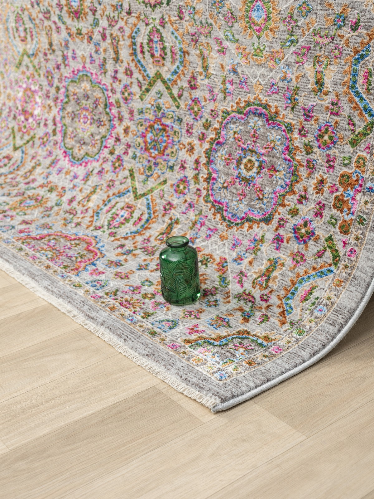 Bu vintage bohem desenli halı, gri zemin üzerinde canlı pembe, mavi, yeşil ve altın sarısı detaylarla öne çıkar. Modern, klasik veya bohem dekorlara zahmetsizce uyum sağlayarak yaşam alanlarınıza sofistike bir dokunuş katar.